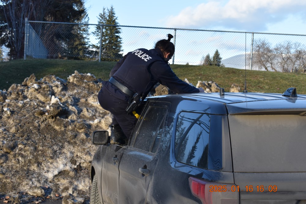 On January 16, 2025, at 2:45 p.m., a BC Highway Patrol officer was doing enforcement when his police vehicle was hit by a car driving in reverse at the corner of 30 Street NE and 2 Avenue NE, Salmon Arm. Luckily was no one was hurt and the Novice driver in the civilian vehicle stayed at scene and was cooperative. But the police vehicle’s door was badly damaged and would not open and there was too much police gear to easily get out through the passenger side.