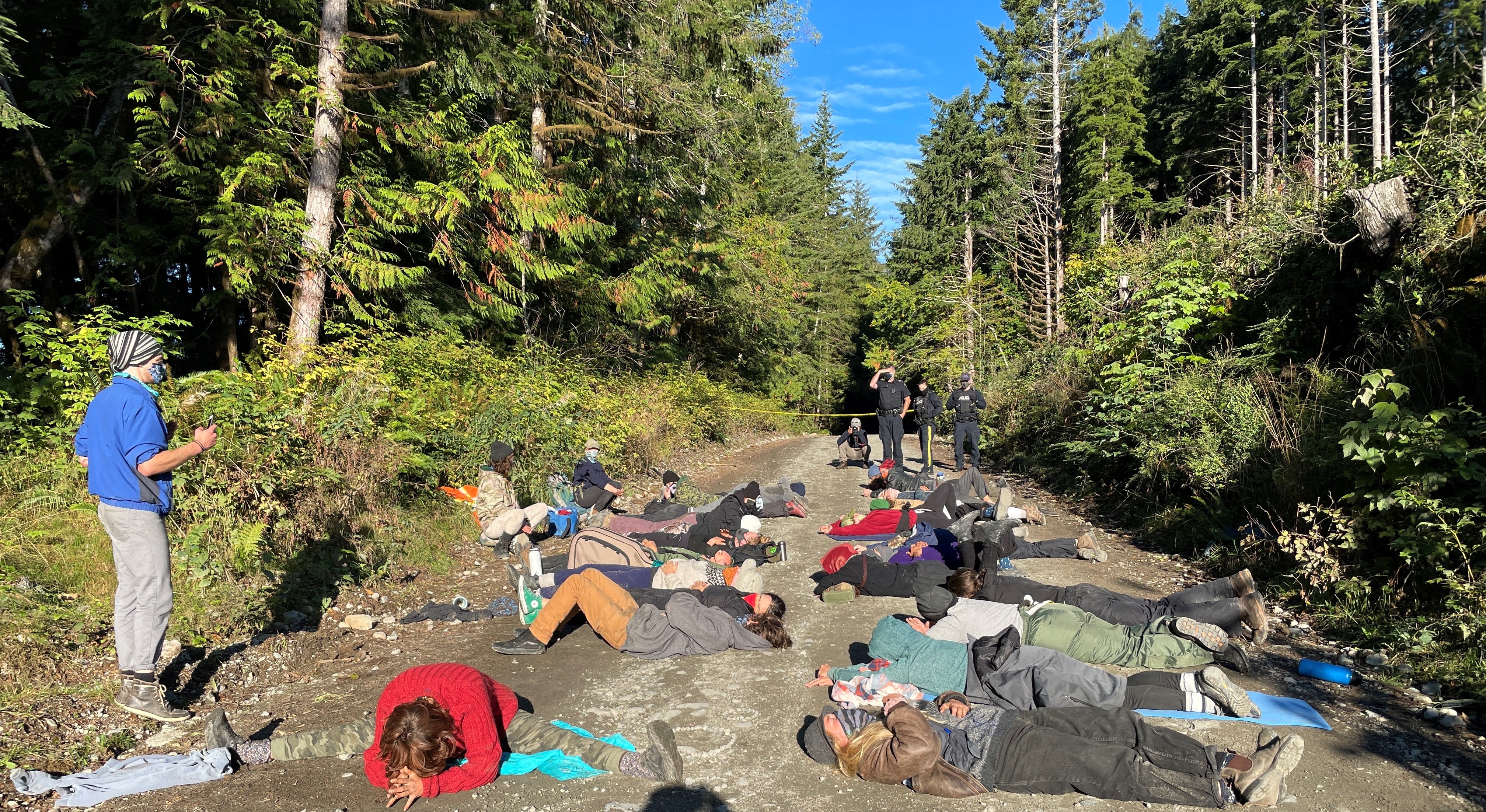 Earlier in the day, while patrolling the forestry roads, police encountered a group of people laying on the ground blocking road access. Efforts to negotiate with the group failed and they refused to leave, resulting in the arrest of 18 individuals, without incident, for breaching the injunction (contempt of court). All were processed and released.