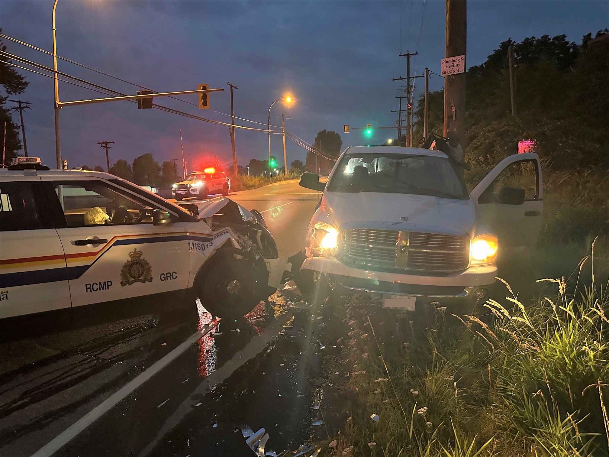 Shortly after 9 pm on July 30, a white Dodge Ram driving west on Lougheed Highway near Norrish Avenue caught an officer’s attention, as it was driving at a very slow speed. Queries of the truck’s license plate showed that the truck’s owner was a prohibited driver, and the truck was also failing to stay in its lane. The officer pulled over the truck, which stopped momentarily, before suddenly reversing into the oncoming lane. As the officer pulled closer, the truck then drove forward into the police car hard enough to deploy the cruiser’s airbags. The pickup truck driver then took off running, but the officer quickly caught up and arrested him. The 55-year-old male driver from Penticton is being investigated for assaulting a police officer with a weapon, flight from police, driving while prohibited, and driving while under the influence of drugs. Anyone who saw this white Dodge Ram (see photo) driving in the area that night is asked to call Mission RCMP, at 604-826-7161.