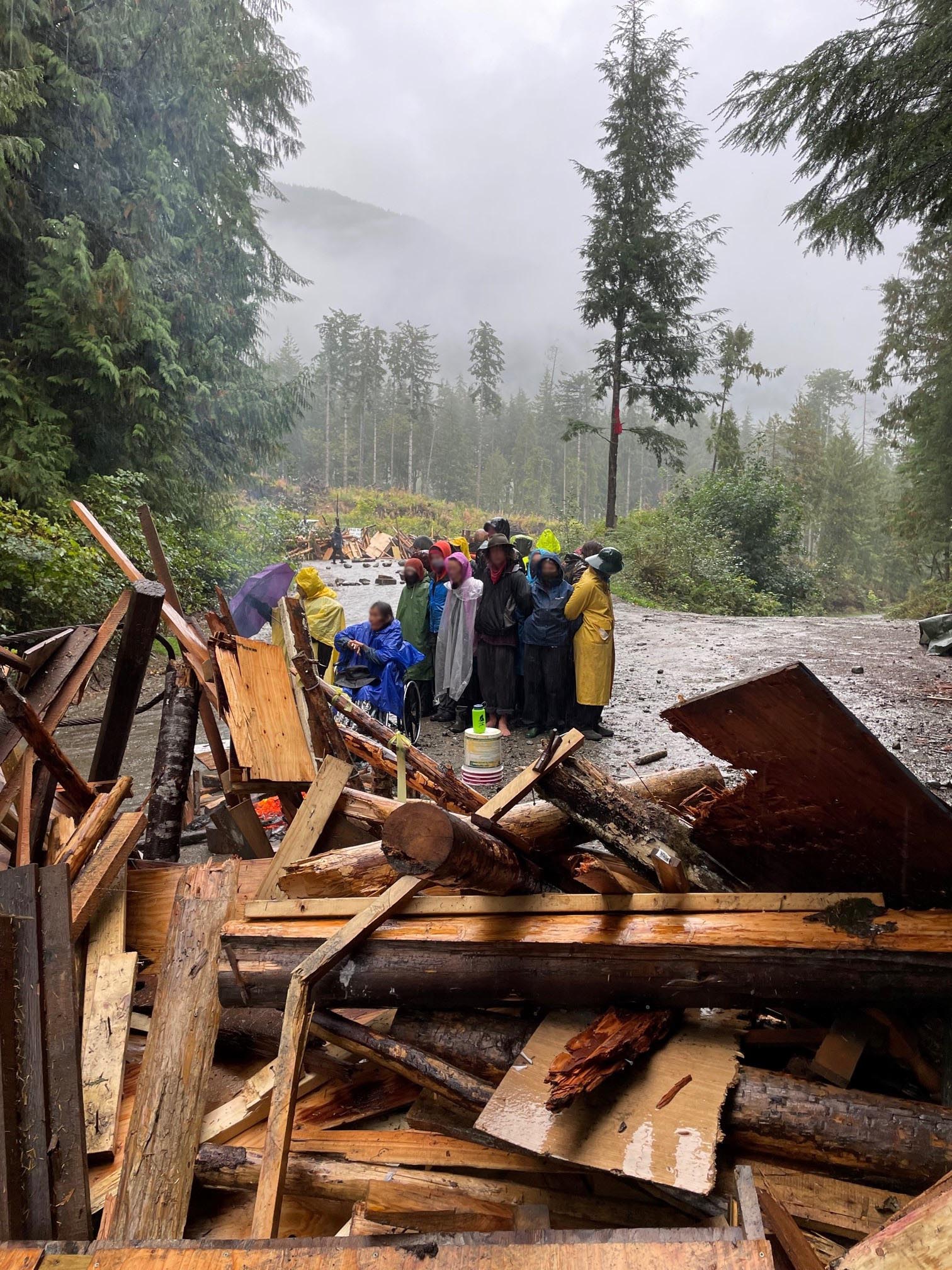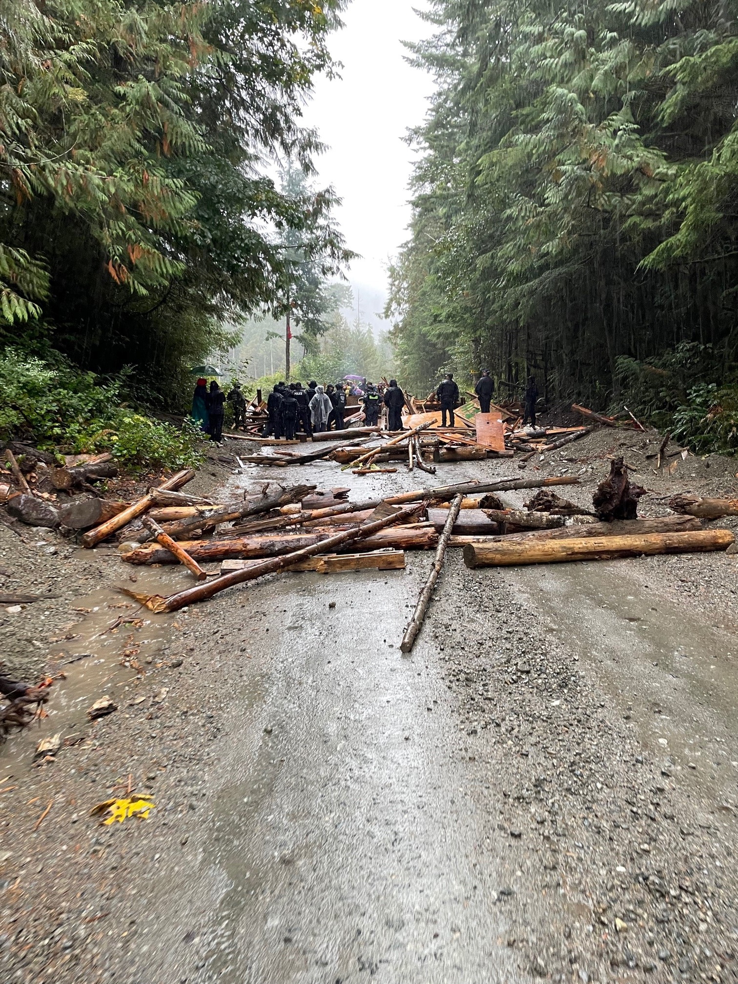Earlier in the day, while patrolling the forestry roads, police encountered a blockade of tree trunks and wood piles, with several other piles of logs in the middle of the road. A group of individuals with linked arms stood behind the larger wood blockade. Despite efforts to negotiate with the group, they refused to leave resulting in the arrest of 23 individuals, without incident, for breaching the injunction (contempt of court). All were processed and released.