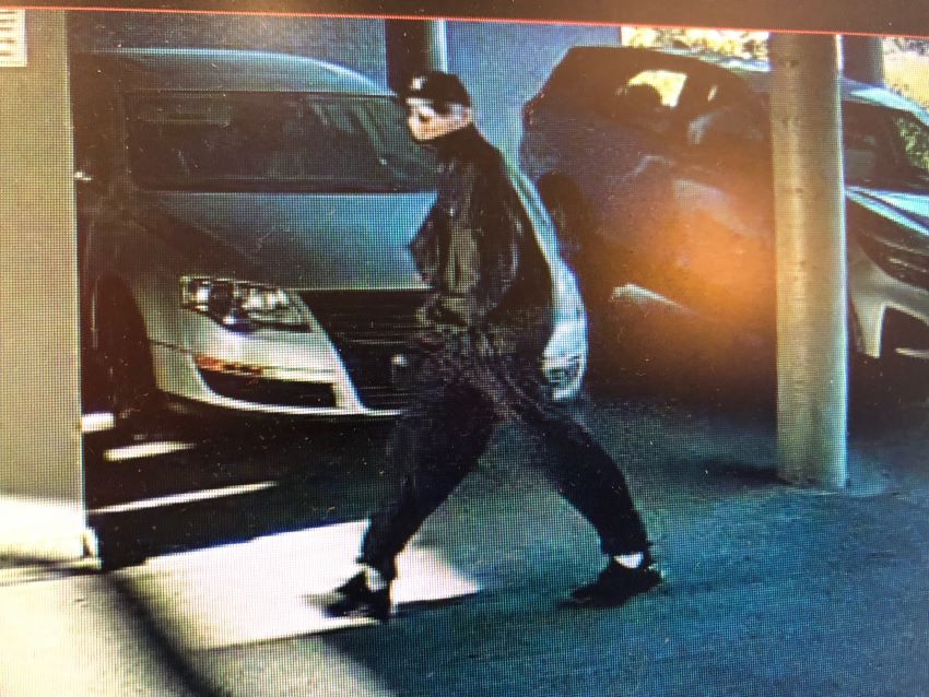 Voir une image agrandie: photo prise du côté droit du suspect qui passe devant des véhicules dans l’enceinte d’un stationnement.