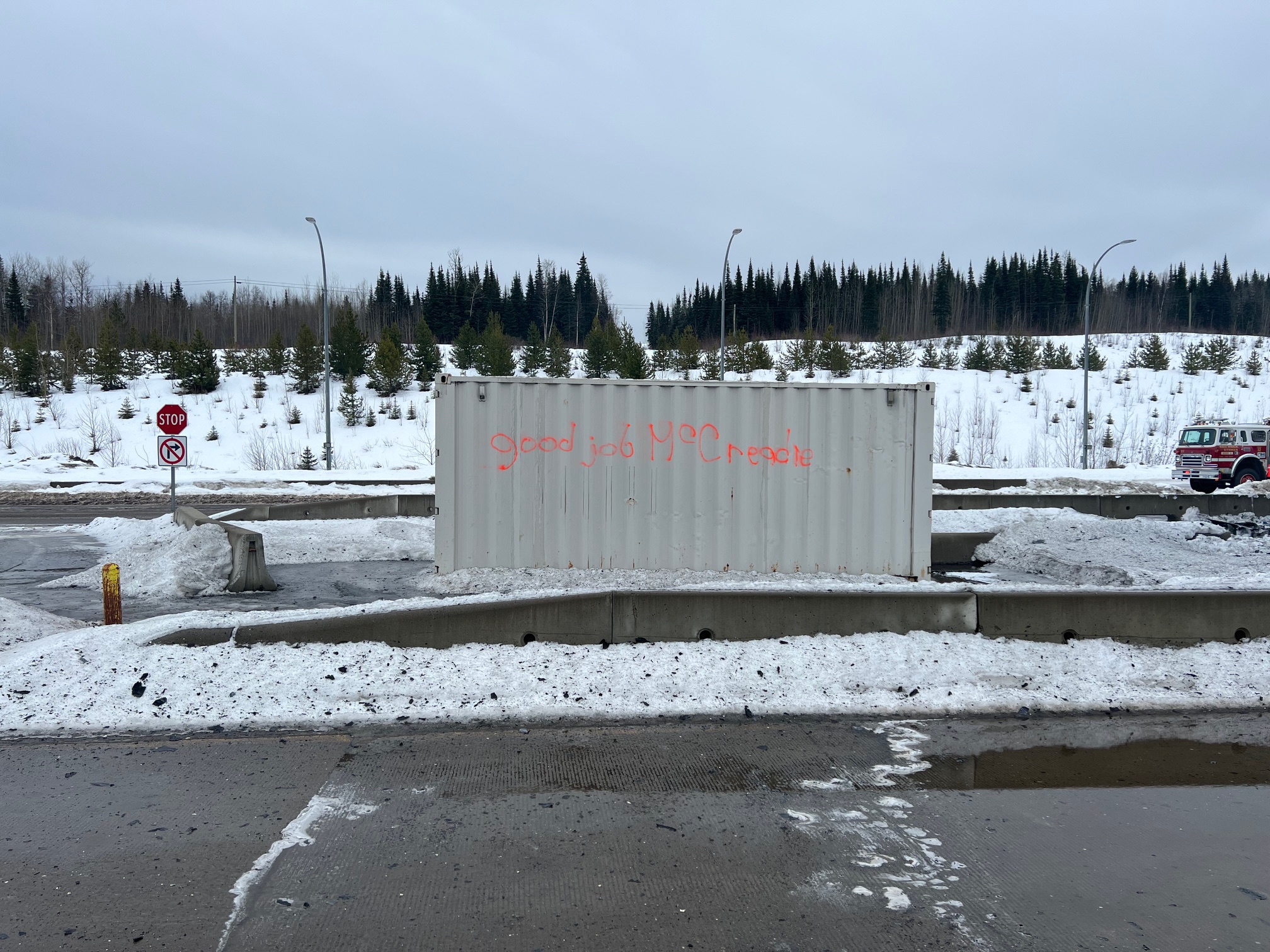 Police officers are also looking into orange spray-paint graffiti on a nearby sea-can that was, according to employees at the location, not there the previous day. The graffiti reads, good job McCreadie. Police believe it may be related to several recent impaired driving investigations and that the graffiti and the arson are connected, states Cpl. Jennifer Cooper, Media Relations Officer for the Prince George RCMP.
