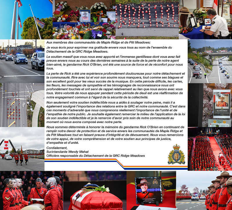 Je vous écris pour exprimer ma gratitude envers vous tous au nom de l’ensemble du Détachement de la GRC Ridge Meadows.Le soutien massif que vous nous avez apporté et l’immense gentillesse dont vous avez fait preuve envers nous au cours des dernières semaines à la suite de la perte de notre agent bien-aimé, le gendarme Rick O’Brien, ont été une source de force et de réconfort pour nous tous.
