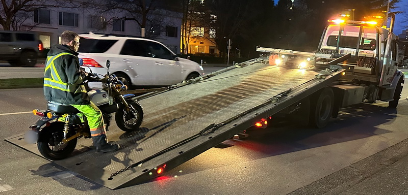 View larger image: Motorcycle being loaded onto flat bed tow truck