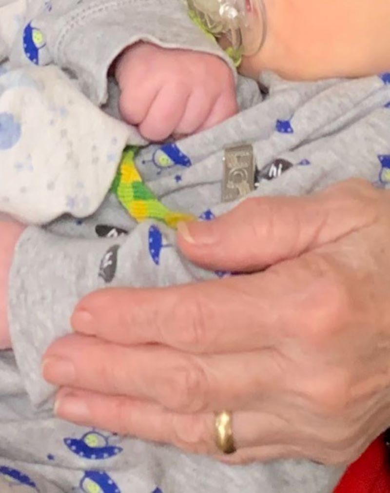 Voir une image agrandie: une alliance en or à l’annulaire d’une femme qui tient un bébé enveloppé d’une couverture.