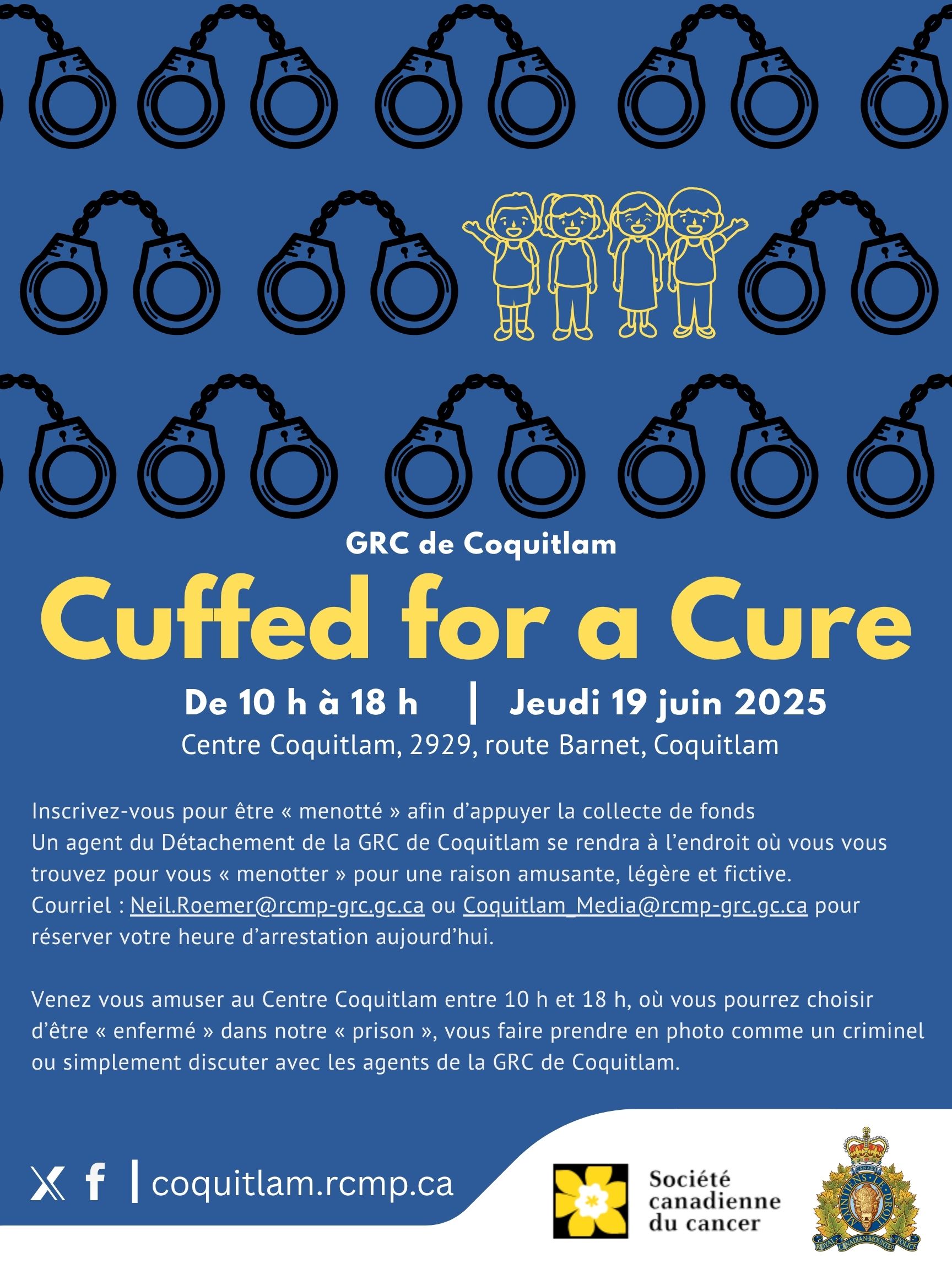 Des agents du Détachement de la GRC de Coquitlam se présenteront au lieu de votre choix (dans le territoire desservi par la GRC de Coquitlam) et vous « menotteront ». Vous pouvez choisir une raison amusante et légère pour votre « arrestation ». Peut-être êtes-vous « trop génial » ou avez-vous « mangé la dernière boule de crème glacée ». Les participants sont invités à prendre des photos afin de les partager avec leurs amis et leur famille en les encourageant à faire des dons à l’événement Cuffed for a Cure. Tous les dons reçus sont directement remis aux efforts de collecte de fonds des Policiers contre le cancer.