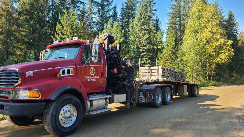 The truck is red with company decals for Kamloops Hiab Services on the side,
