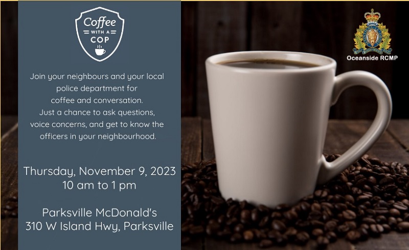 Oceanside RCMP and Parksville McDonald’s are hosting a Coffee with a Cop event in November.