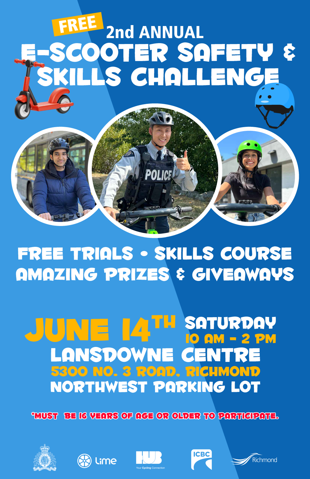 Richmond RCMP is inviting the community to roll into summer safety by participating in the second annual E-Scooter Safety & Skills Challenge. This event is designed to educate new and experienced riders on how to navigate Richmond’s streets confidently and legally on electric scooters.