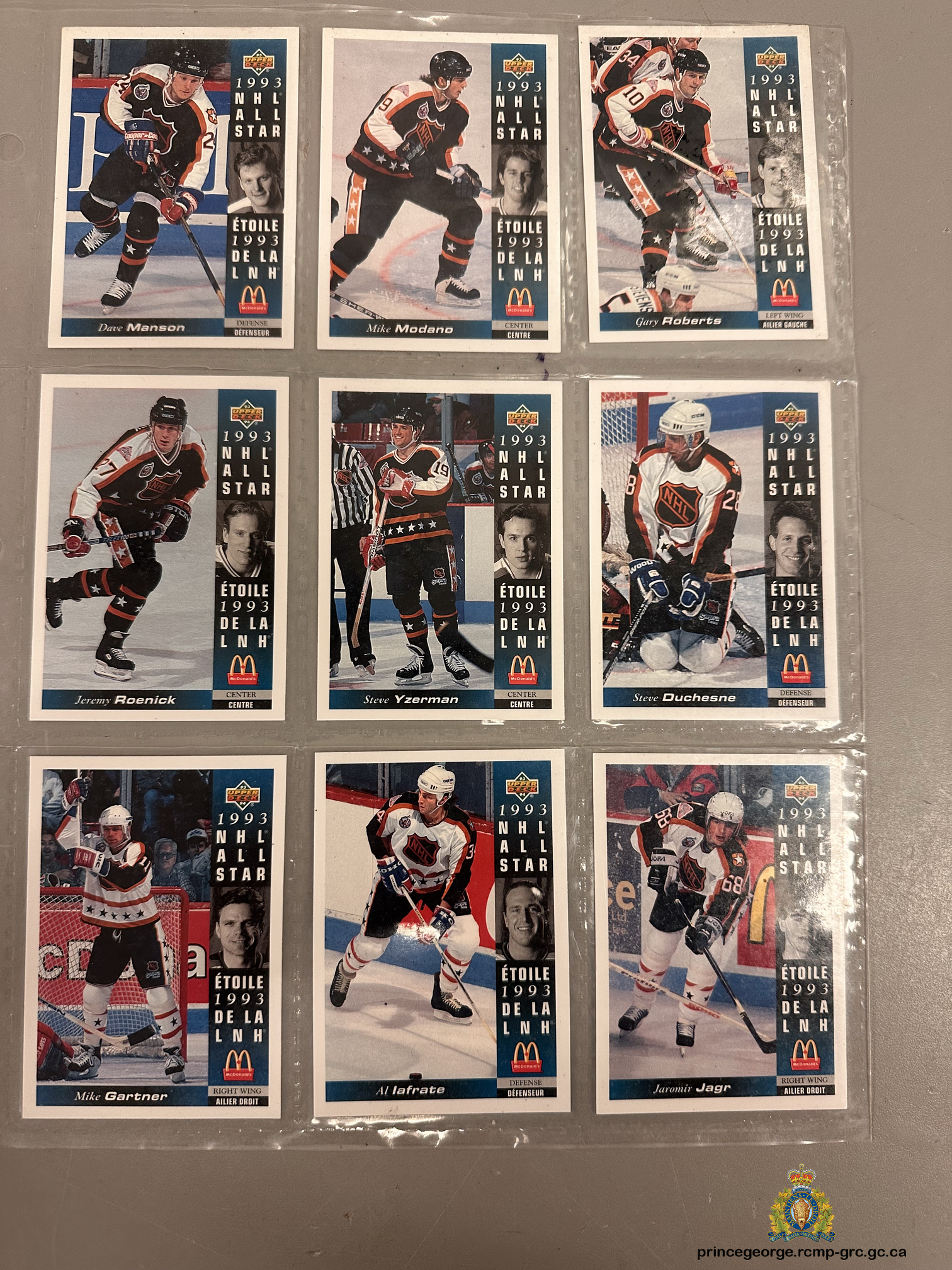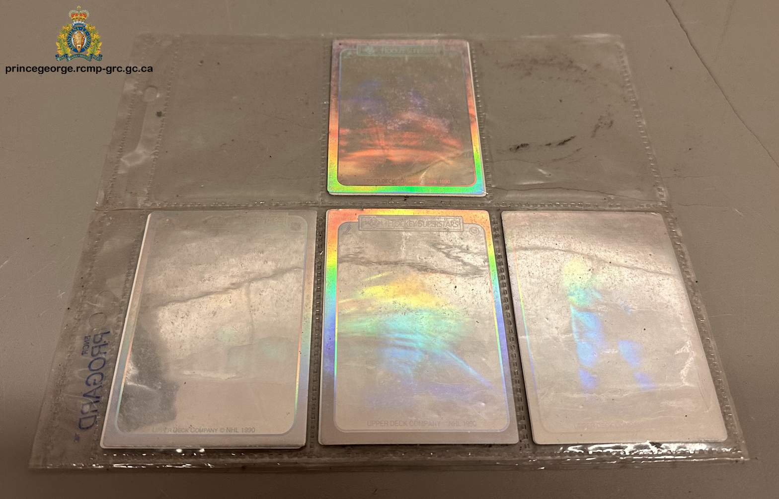 The hockey cards appear to be a set and likely have sentimental value for whomever has lost them. If you believe them to be yours, you can contact an investigator by calling our non-emergency line. You will need to bring proof of ownership, or be able to speak to how you know the cards to be yours, to have them released to you, states Cpl. Jennifer Cooper, Media Relations Officer for the Prince George RCMP.