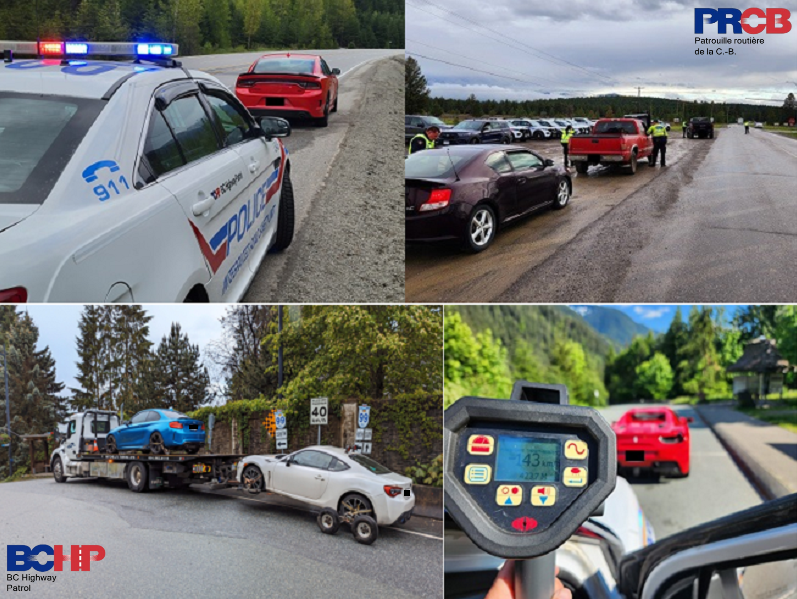 BC Highway Patrol members targeted the top high-risk driving behaviours contributing to serious injury and fatal collision on our highways, targeting Excessive Speeding, Aggressive/Dangerous Driving, Impaired Driving, and Distracted Driving. During the May long weekend BC Highway Patrol served over 2830 violation tickets including to speeders, street racers, and prohibited drivers. BCHP officers also conducted road blocks across BC and removed over 80 impaired drivers from our highways.