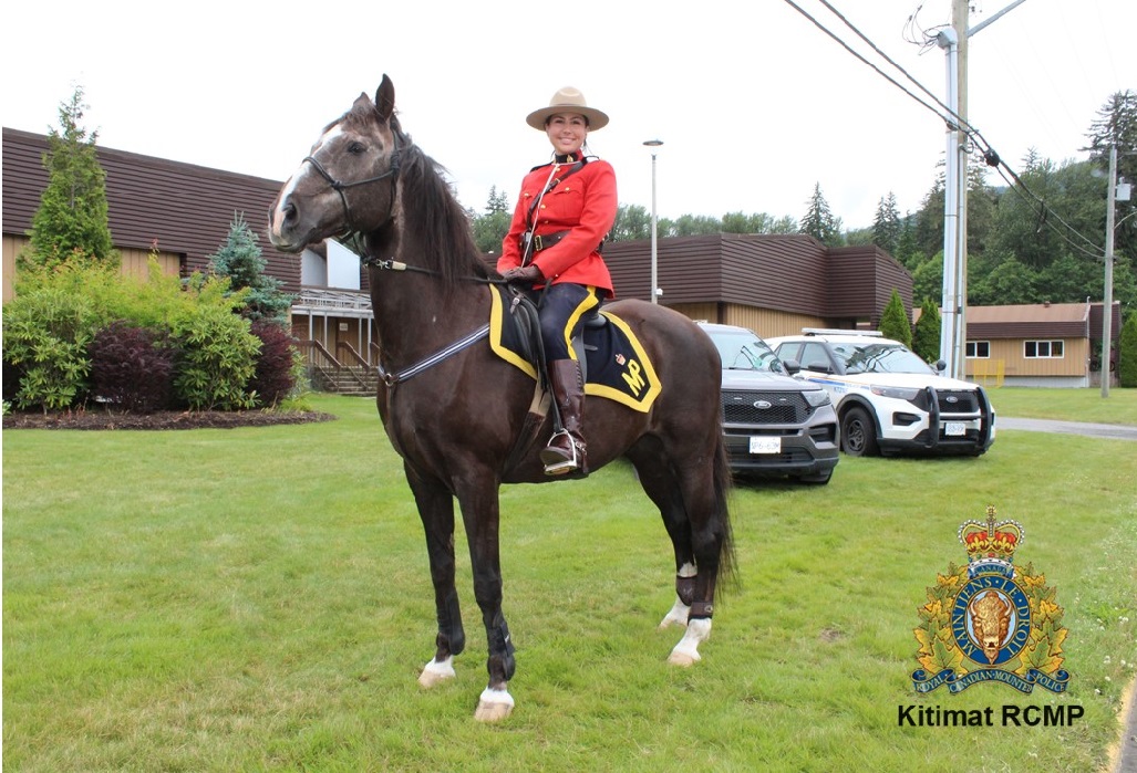 The Kitimat RCMP are pleased to report that the Canada Day long weekend generated very few files for the local detachment. During the concert at Riverlodge, there was only one file generated to assist in locating a missing child after the fireworks. Luckily, they were located by the family very quickly after wandering off. The Kitimat RCMP officers also assisted with ensuring the flow of traffic did not cause major issues at the end of the evening. One intoxicated male was aided at the end of the event. There were no files generated or issues reported during the July 1st Parade and Riverlodge events. Several locals and visitors came over to visit and get photos with Cst Poelzer and Brisk, the RCMP officer and horse that lead the parade this year. A lot of photos were taken of the Red Serge clad Mounties in attendance as well. The Kitimat RCMP would like to thank Bob, Brisk’s owner, for allowing us to have Brisk join our troop and a thank you to the Army Cadets that ensured the roadway stayed clean behind Brisk.