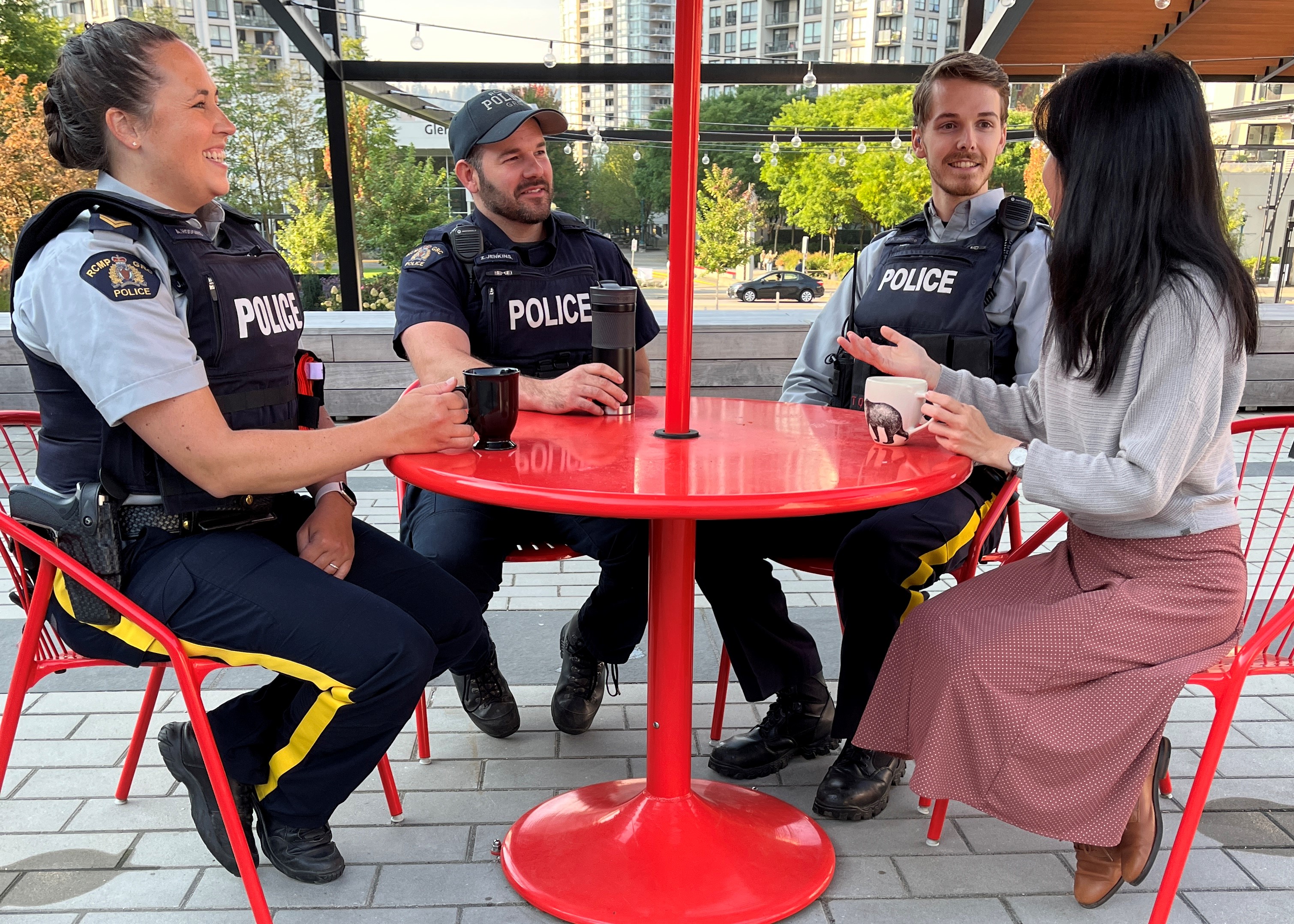 View a larger image - Police officers sitting outside around a table while drinking coffee and talking to the public
