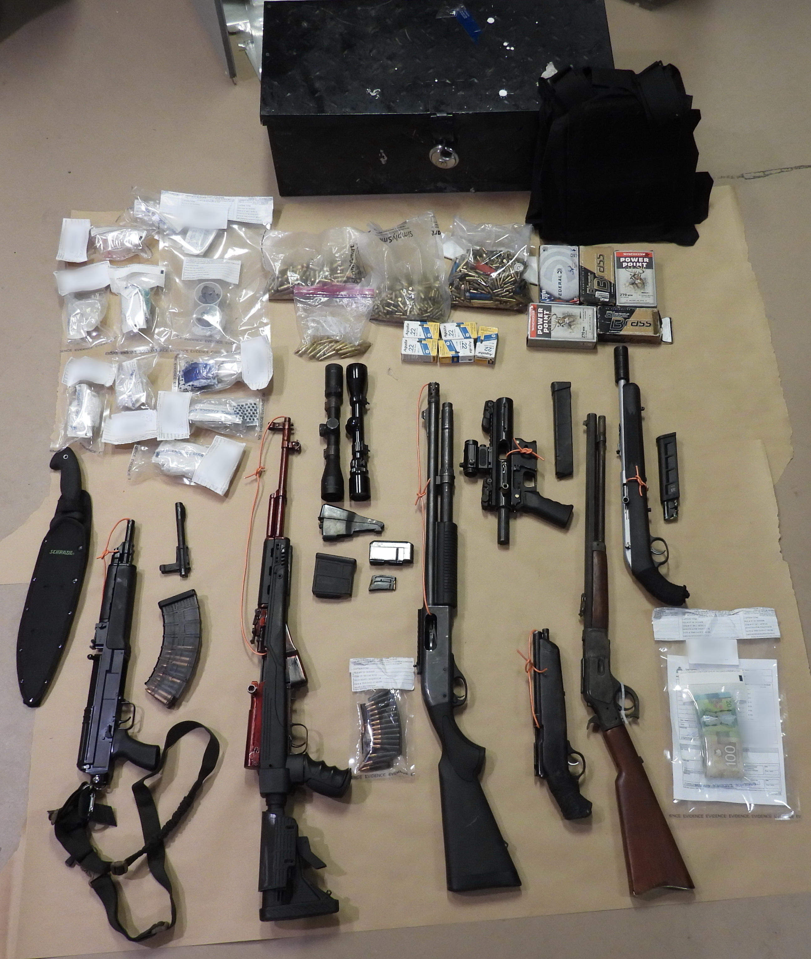 Cliquez ici pour un plus grande photo des armes et drogues saisies.