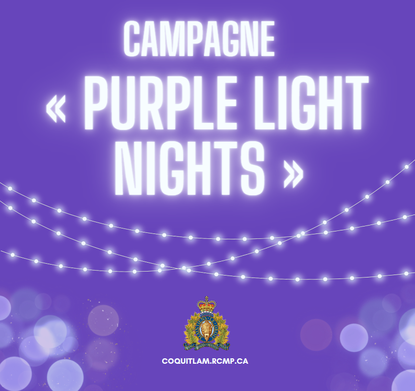 Le Détachement de la GRC de Coquitlam sera illuminé à l’occasion de sa première campagne annuelle « Purple Light Nights » qui contribue à mettre en lumière la violence conjugale. La campagne a pour but de rendre hommage aux personnes qui ont perdu la vie à cause de la violence conjugale, de soutenir les survivants et de donner de l’espoir aux personnes qui vivent encore en situation de violence. Les lumières brilleront d’une couleur violette au détachement principal du Détachement de la GRC de Coquitlam et aux bureaux de services de police communautaires à compter du 25 novembre 2023.