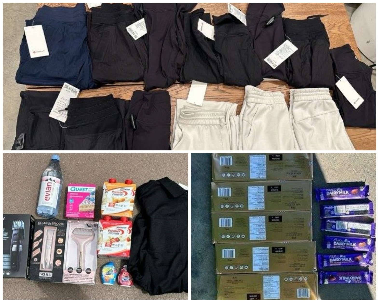 View larger image: collage of recovered items including athletic pants, electronics, convenience products, and candy bars