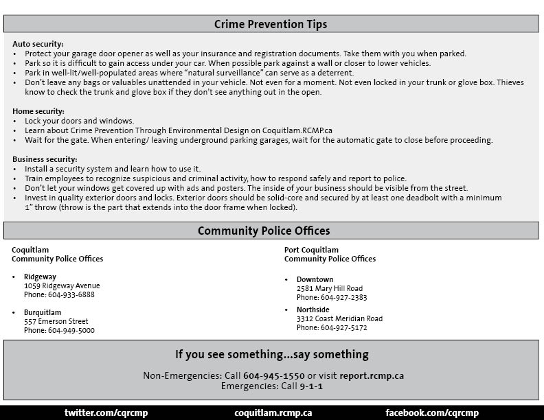The Coquitlam RCMP urges area residents to call 604-945-1550 to report anything suspicious and to call 9-1-1 to report crime in progress. The information you provide to us, no matter how minor it seems to be, is very valuable and we need your help to keep our community safe. Visit our website for information on joining Coquitlam RCMP's Block Watch.