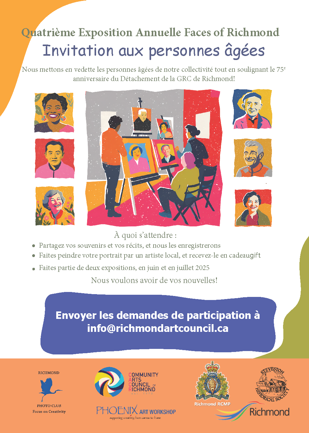Pour obtenir de plus amples renseignements sur l’initiative « Les visages de Richmond » et pour participer, veuillez envoyer un courriel à l’adresse info@richmondartscouncil.ca.