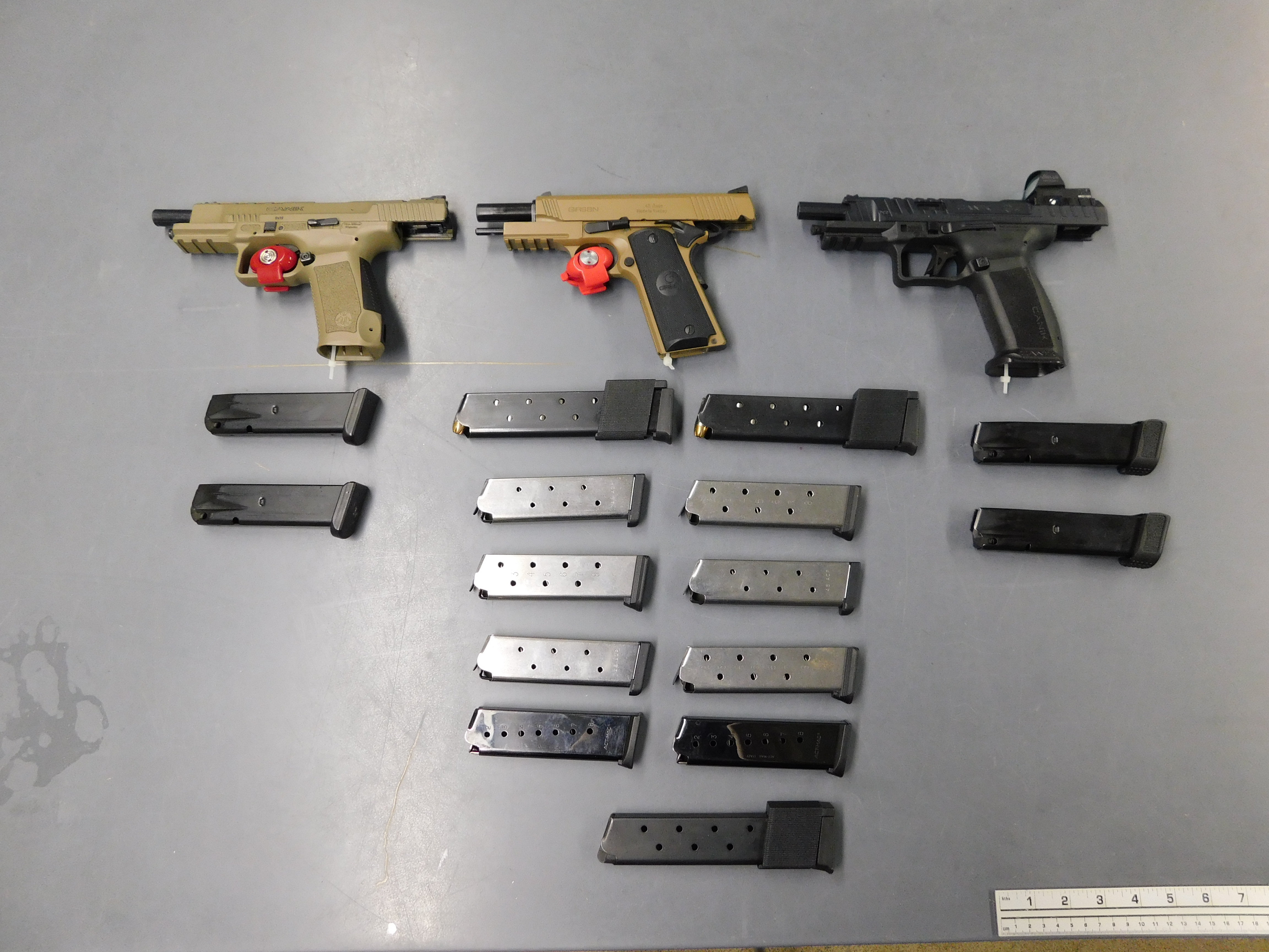 Larger image of: Three semi-automatic handguns two tan and one black, with several magazines on a table